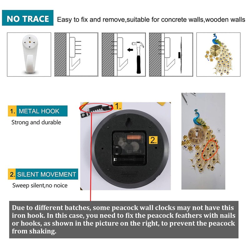 - 【Silent Movement】:The silent peacock clock movement provides you a noiseless environment to sleep and work. Besides, the high quality clock movement also guarantees the smooth movement of clock hands, thus ensuring better time accuracy and longer working life.