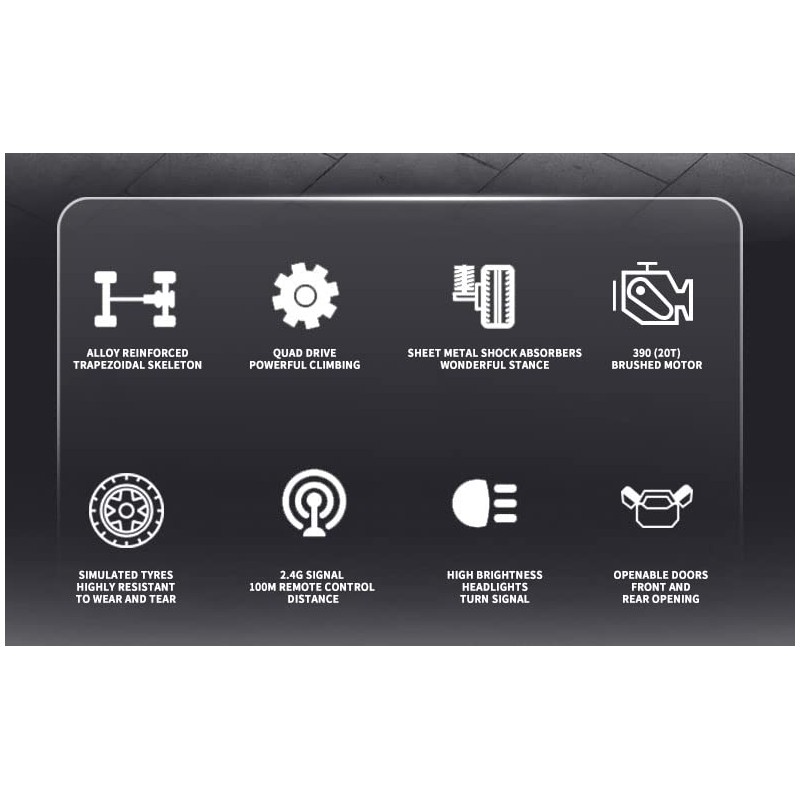 - ● Simulated Design: This RC car is designed with all-round simulated control, rubber tires and light as well as full-scale steering gear, sturdy and resistant to impact and collision.
