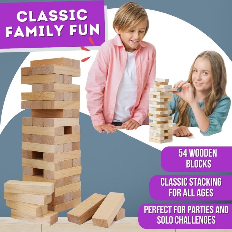 - 🎲 Classic Tower Stacking Fun: Enjoy hours of entertainment with this timeless wooden stacking game! Features 54 precision-crafted blocks for building & balancing fun, perfect for family game nights & parties.
