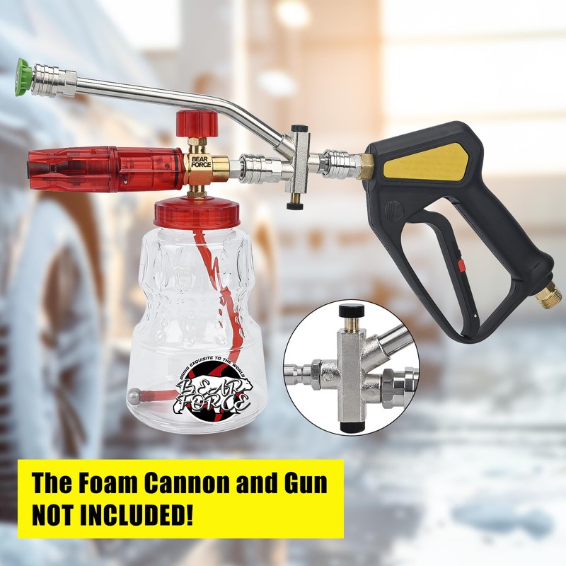 - MULTIPLE CHOICE CONNECTOR: Bear Force versatile tool features a unique design with two different connector ends - a longer one for the power washer nozzle and a shorter one for the snow foam lance. This strategic arrangement ensures unobstructed water flow when using the nozzle, even with the foam dispenser connected.