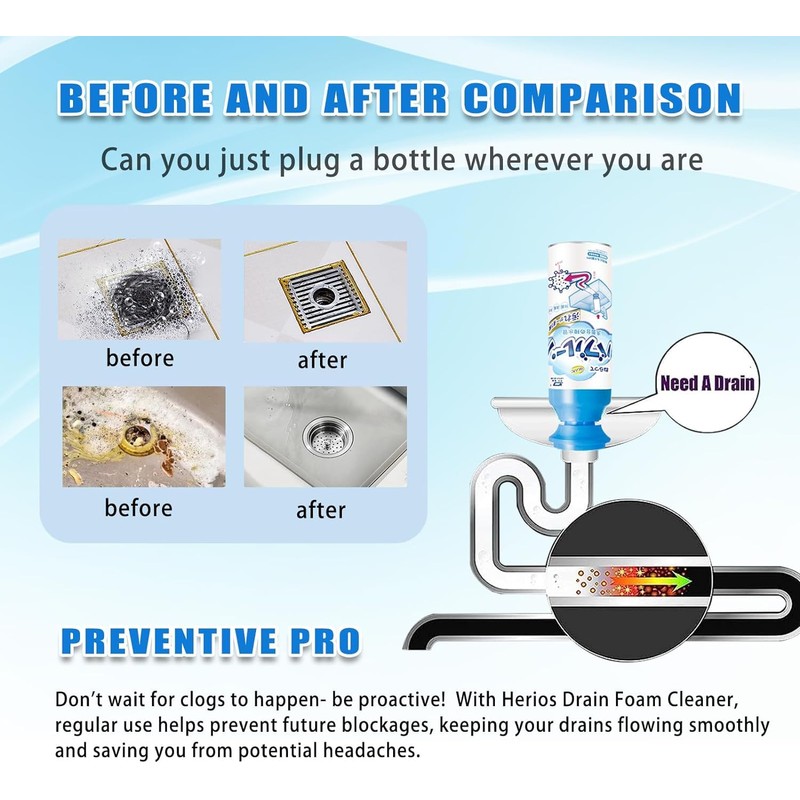 Drain Foam Cleaner, Foam Drain Cleaner, Powerful Sink and Drain Cleaner Foam, Liquid Hair Drain Clog Remover, Foaming Drain Cleaner for Kitchen Drain, Sinks, Tubs HERIOS