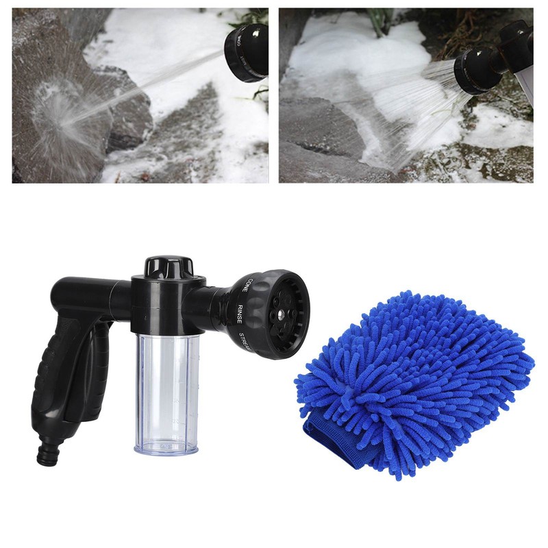 1、8 Spray Patterns: The foam gun has 8 spray patterns, which can be set by rotating (flush, flow, plane, center, spray, shower, spray and cone). 2、Simple Operation: The foam sprayer is more convenient to operate when the perfect combination of detergent bottle and soap dispenser. 3、Durable Material: The foam sprayer is made of excellent rubber, non slip and easy to grip, and can be used with a standard garden hose. 4、High Efficiency: There is no need to continuously squeeze the trigger during the spraying process, just press to start working. 5、With Gloves: Equipped with high density cleaning gloves, with good flexibility and water absorption, can easily wipe off dirt. 6、Wide Applications: Commonly used for watering garden lawn plants, washing cars and bathing pets, etc., with strong practicability.