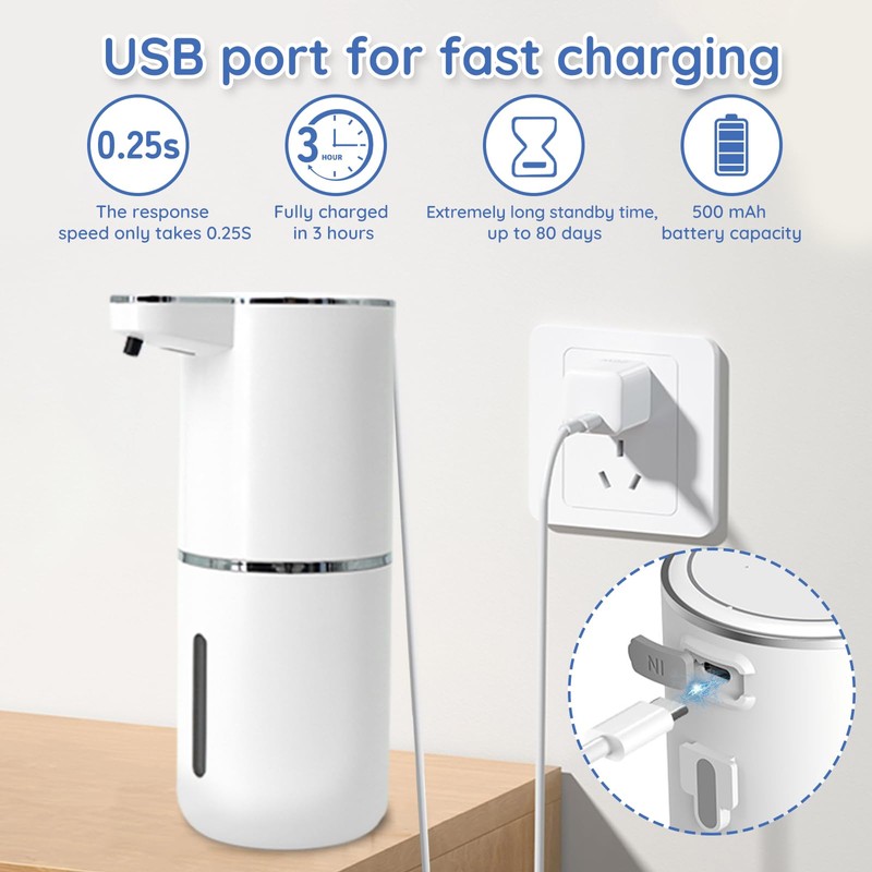 - 【USB-C Rechargeable Soap Dispenser】This soap dispenser automatic is powered by a built-in 500mAh rechargeable battery that lasts up to 3 months on a single charge. With USB-C fast charging, you can enjoy long-lasting performance without the hassle of constantly replacing batteries. Convenient and energy-efficient for everyday use.