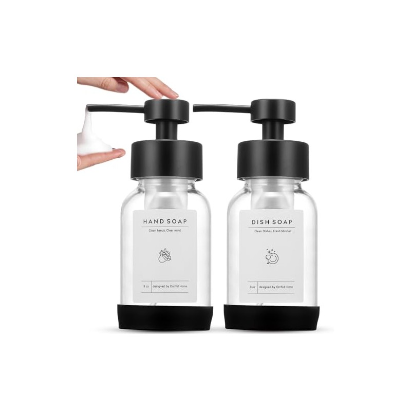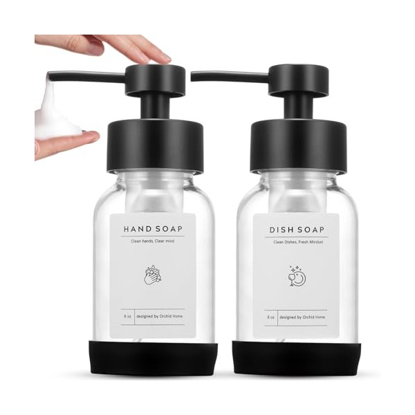 Foaming Soap Dispenser Set, Glass Foam Soap Dispenser with Plastic Pump, 8.5oz Empty Refillable Glass Bottle for Liquid Soap - Kitchen, Bathroom, Commercial