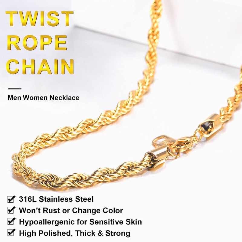 - ✔Twist Rope Chain for Men&Women - 3mm 20nch stainless steel gold plated rope chain necklace, as rope chain only, also suit for men's women's pendant. There are many choices for length and color. Must be a size for you.