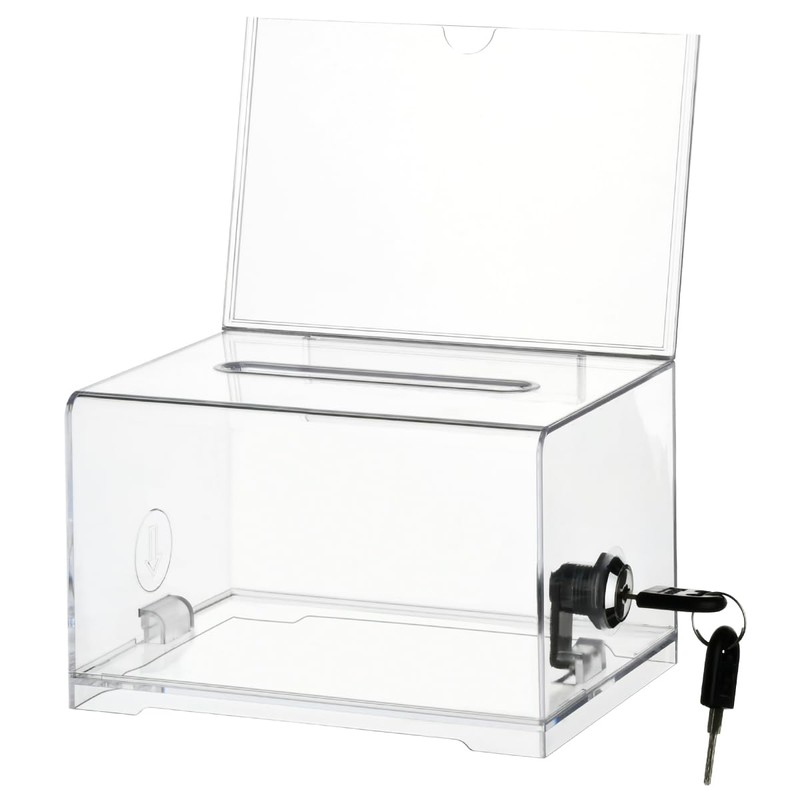 FOCCTS Clear Acrylic Donation Box with Lock, Ballot Box Suggestion Box Tip Box With Sign Holder, Raffle Ticket Box Clear Lock Box for Voting Donation Ticket Comment Tips(6.2" x 4.5" x 4")
