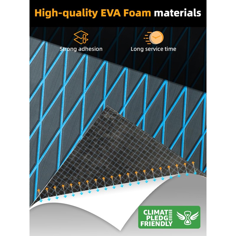 - High Quality EVA Foam - FOCEAN Boat flooring uses high-quality EVA(Ethylene-vinyl Acetate) material, Not easy deformation; High tensile elongation; Not easy to tear or damage; Not easy to fade; High density. Maintain a constant temperature, not easy to absorb heat; Odorless, non-toxic. Strong glue at the back(Extra with super glue), Non-Slip Self-Adhesive. Hardness: 55 (±1P)