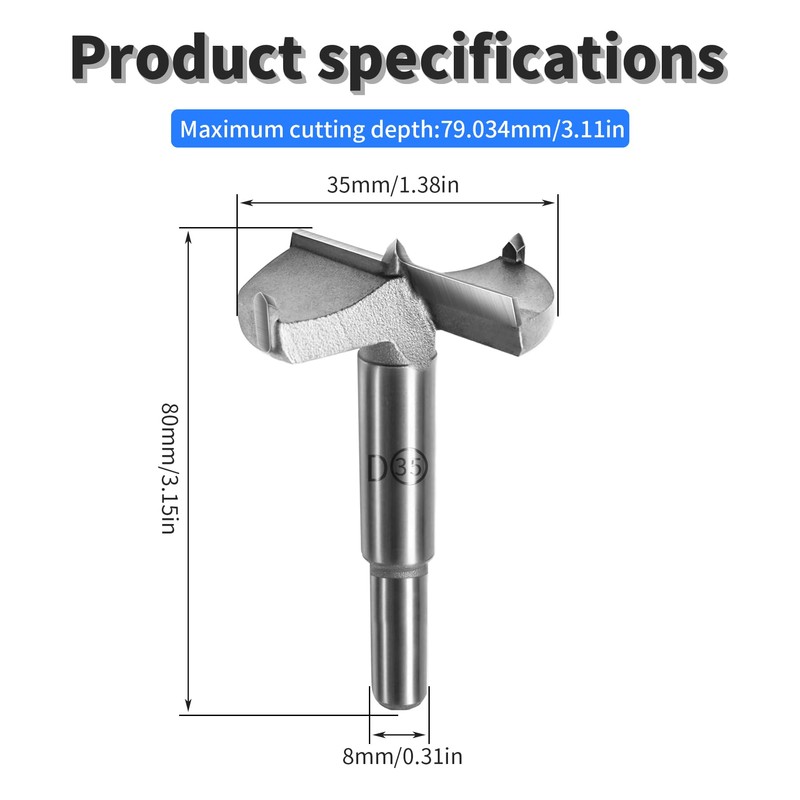 • 【1-3/8" forstner bit】Drilling Diameter: 35mm/1.38in; Shank Diameter: 8mm/0.31in; Cutting Depth: 79.029mm; Total Length: 80mm/3.15in; Round Shank