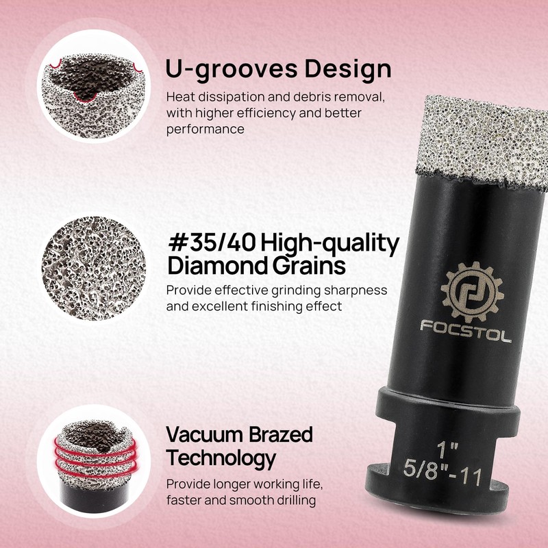 FOCSTOL Diamond Core Drill Bit - 1''(25mm) Vacuum Brazed Diamond Hole Saw for Porcelain Ceramic Tile Marble Granite Quartz 5/8''-11 Thread