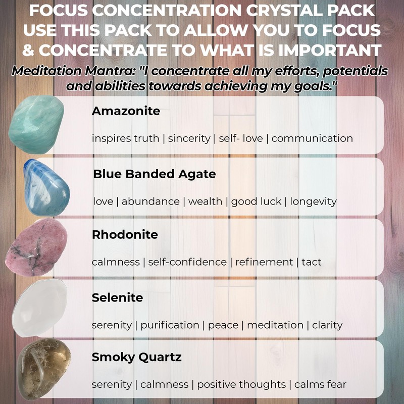 - Holistic Approach to Focus: This UK-designed 5 stone premium selection, featuring Amazonite, Blue Banded Agate, Rhodonite, Selenite, and Smoky Quartz, is tailored to enhance sincerity, wealth, calmness, and peace, aiding in improved concentration.