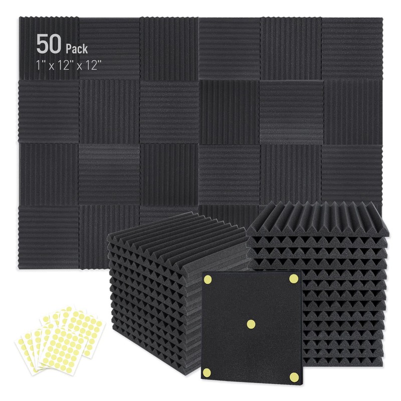 Focusound 50 Pack Acoustic Foam Panels 1" x 12" x 12" Sound Proof Foam Panles Soundproofing Noise Cancelling Wedge Panels for Home Office Recoding Studio with 300PCS Double-Side Adhesive
