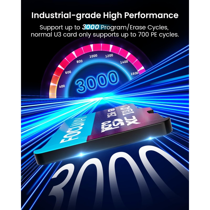 - Industrial Grade Durability: Built for rigorous conditions, providing reliable performance in extreme temperatures and tough environments. Support up to 3000 Program/Erase Cycles, whereas standard U3 model memory cards can only support up to 700 cycles. FOCUWAY new industial-grade memory cards' performance is more than four times that of ordinary cards.
