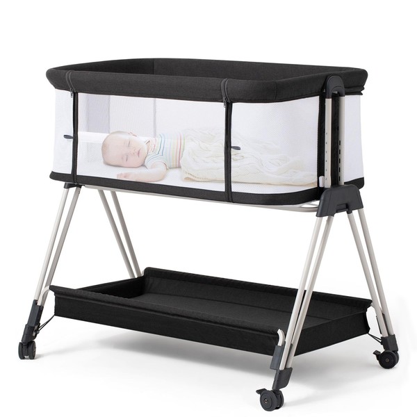 Fodoss Baby Bassinet Bedside Sleeper with Wheels and Storage Tray,4-Sided Mesh Bedside Bassinet for Infant/Newborn,7 Height Adjustable Easy Folding Bedside Crib