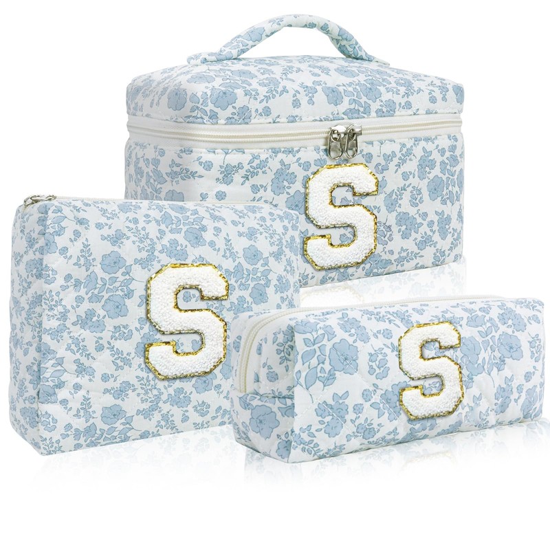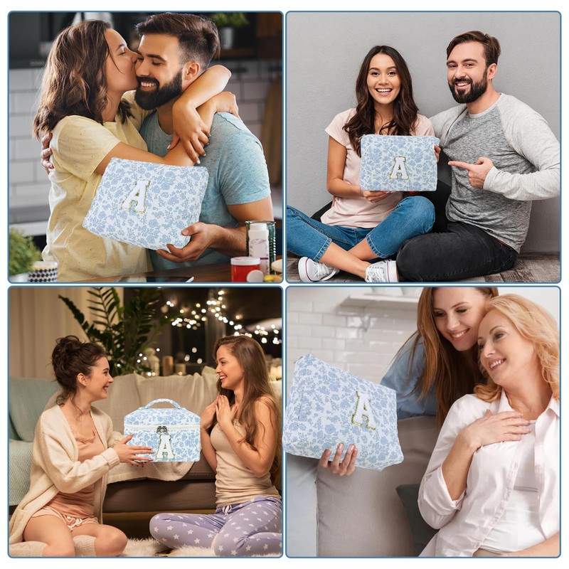 - 【Birthday Gift for Teen Girls & Women】: This makeup bag set comes with beautiful blue floral pattern, full of vitality and elegance, fluffy letter patches with gold sequins are sewn on the makeup bag, you can choose the initials that represent your name or special meaning. This women's makeup bag is a great gift for women, teen girls, sisters, mom, wife, aunt and friends on birthdays, New Year, Valentine's Day, Mother's Day or weddings