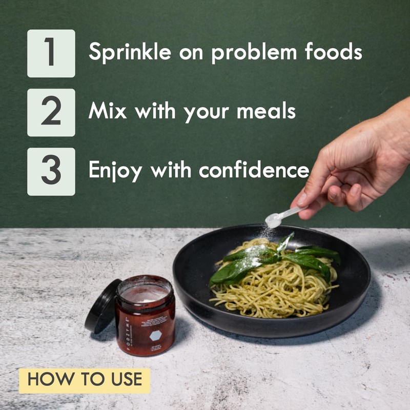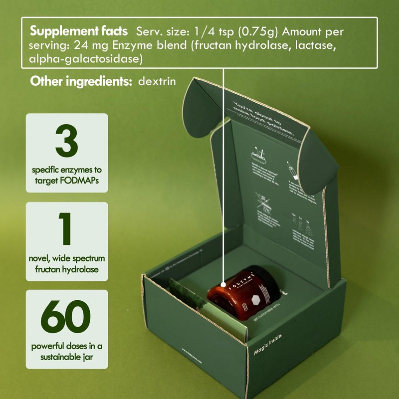 Enjoy garlic, onion, wheat, and more with confidence. FODZYME 60-dose Home Kit breaks down Fructan, Lactose, and GOS, helps you enjoy your favourite meals (with garlic, onion, wheat, and more) painlessly without chronic gut distress. FODZYME is virtually tasteless, does not change the texture of food. Some people with sensitive taste buds note a slight sweetness. Monash Low-FODMAP Certified | Vegan | Dairy-free | Gluten-free | Soy free | Egg-free | Casein-free NOTE: FODZYME does not yet address foods containing polyols (the P of FODMAP). Ingredients: Fructan hydrolase, Lactase, Alpha-Galactosidase. Other ingredients: Dextrose, Dextrin, Maltodextrin. CONTAINS NO: GMO, Gluten, Milk, Casein, Soy, Egg, Artificial Colours or Flavours. All ingredients are sourced from a US-based manufacturer. They are mixed and packed in a US-based cGMP FDA-registered facility. Directions & serving size Sprinkle and stir 1/4 tsp (0.75g) dose of powder on trigger food right before eating. Sprinkle a second dose if still eating after 30 minutes. Add directly to problem food - The powder works best when mixed directly with meals. Chew well and savor - chew well to help the enzymes integrate with FODMAPs and activate instantly. Don't heat up - Avoid adding to cooking, as enzymes will deactivate at very high temps. Dose up if needed - if you're eating a lot of high-FODMAP foods or are extra sensitive, we recommend adding a booster dose midway through. Is FODZYME suitable for you? FODZYME does not target specific conditions rather, FODZYME's enzymes break down triggering substances (fermentable fibers) that are known to ferment by gut bacteria. NOTE: Included spoon is located within the tub. During shipping, it may become partially concealed in the jar.