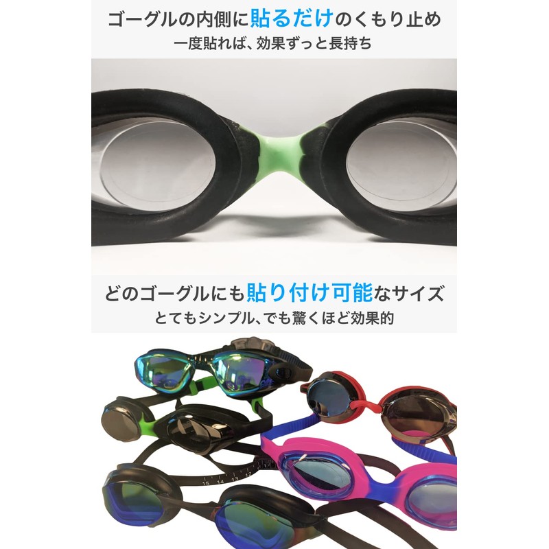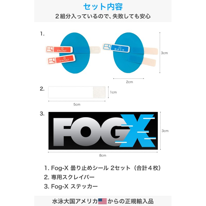 • Product Contents: Fog-X Anti-Fog Stickers Set of 2 (4 pieces total) and a dedicated scraper. 2 sets for peace of mind even if you fail The color of the anti-fog sticker is clear. Both sides of the sticker have a protective film, please remove it before use. Genuine and imported from the United States of Swimming
