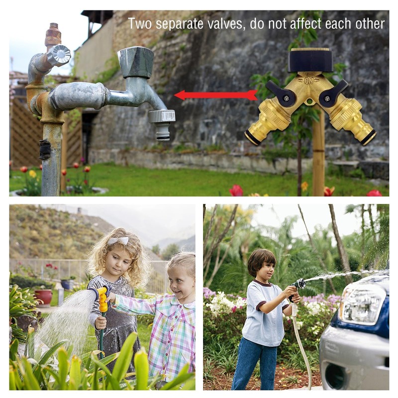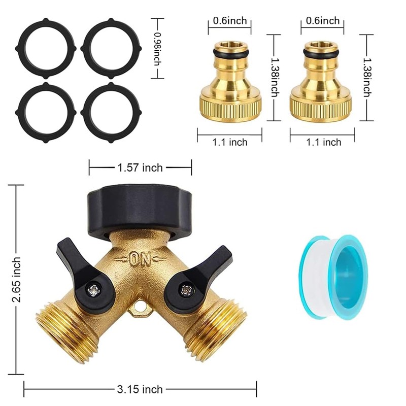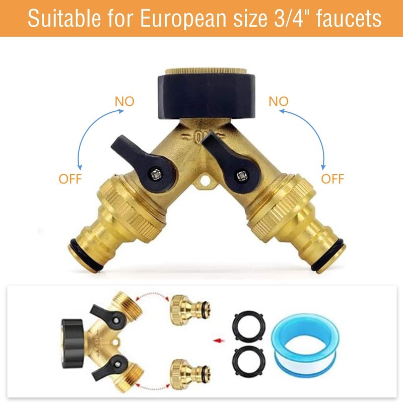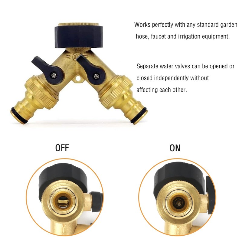 - Garden hose and adaptor: 1 x 2 way Y splitter + 2 x 3/4 inch quick connectors. Use our solid brass Y connector to split your garden faucet into two outlets with shut-off valves on each side