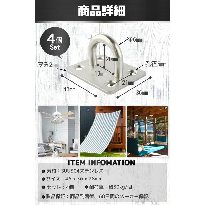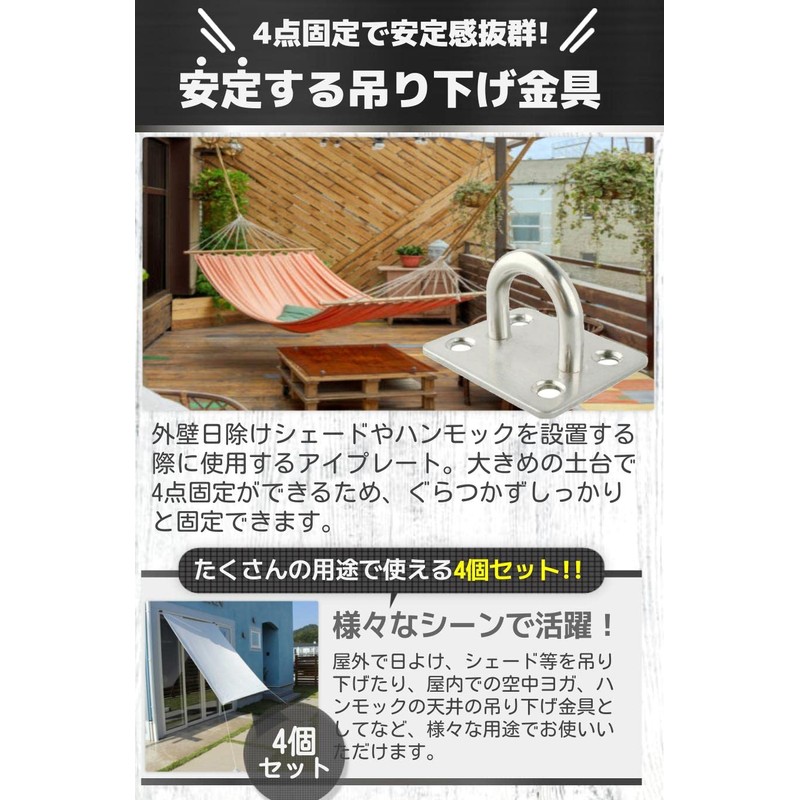 - [Stable Hanging Hardware] Eyeplate used to install exterior shade or hammock. The large base can be fixed at 4 points so it can be firmly fixed without wobbling. It can be used for a variety of purposes, such as hanging sun shades, indoor aerial yoga, hammock ceiling hanging hardware