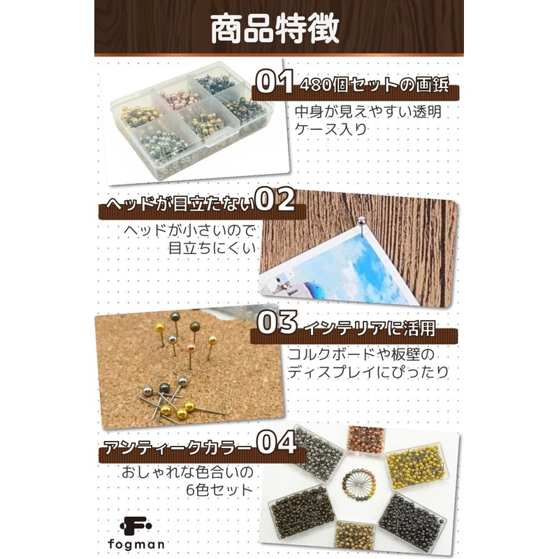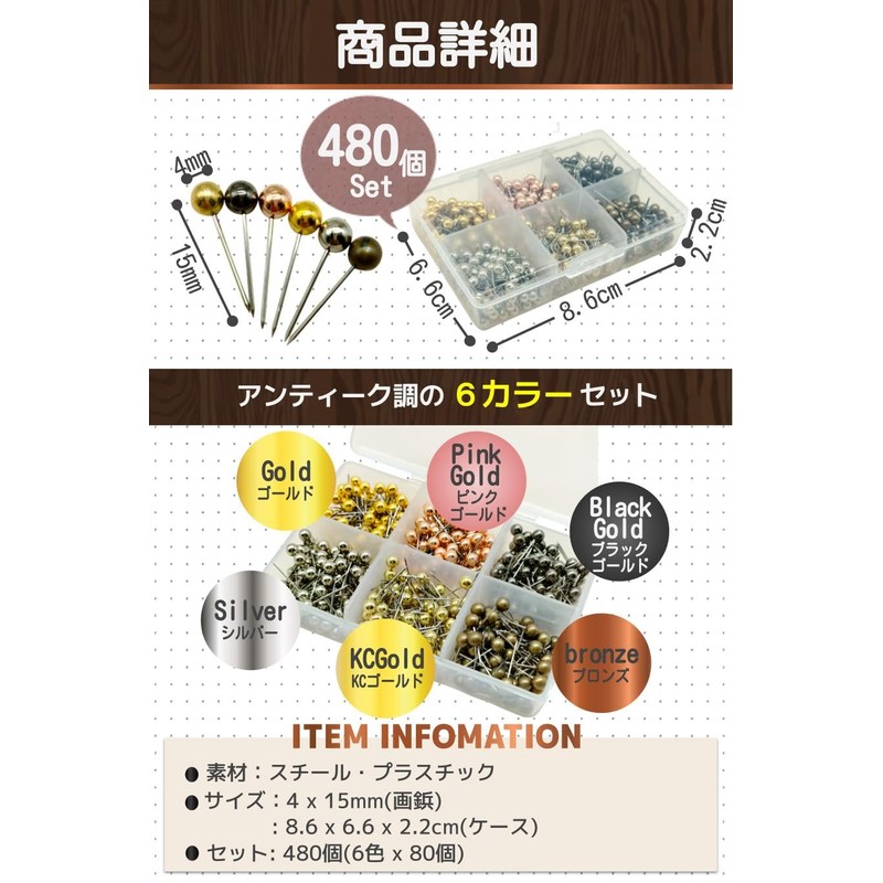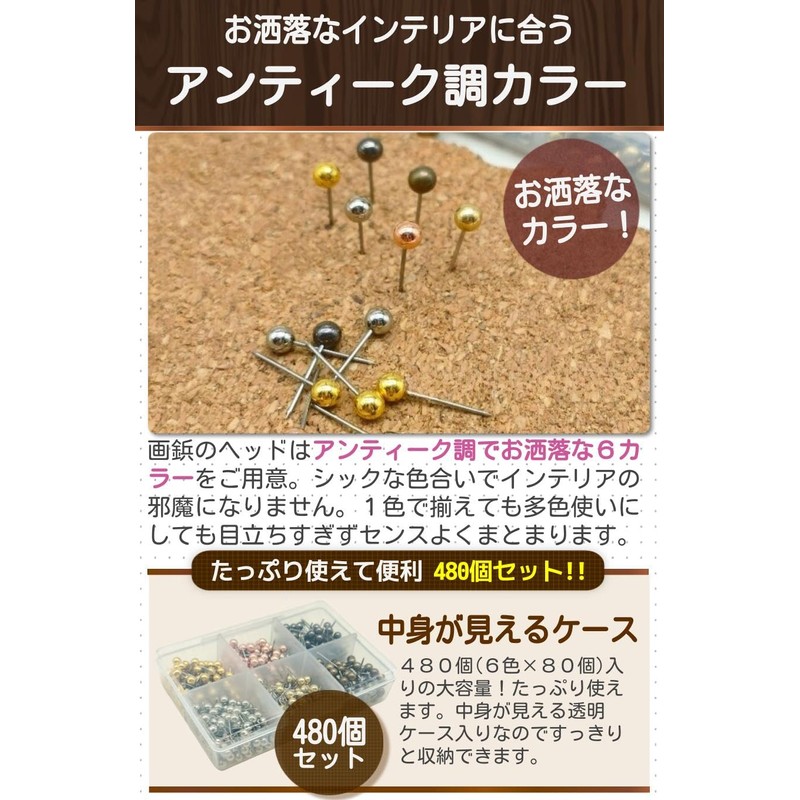 - Product Features: 1. Set of 480 push pins: Comes in a transparent case that makes it easy to see contents; 2. Discreet head: Small head makes it difficult to stand out; 3. Interior use: Perfect for displaying cork boards and plank walls; 4. Antique color: 6 color set with fashionable colors