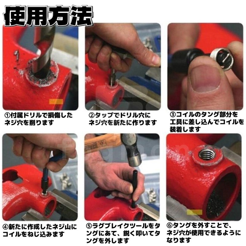 - How to Use: 1. Sharpen the damaged screw holes with the included drill, 2. Use a tap to create a new screw hole for the drill hole. 3. Insert the tongue of the coil into the tool and attach the coil. 4. Screw the coil into the newly made thread. 5. Place the lug break tool on the tongue and tap it sharp to remove the tang. 6. By removing the tongue, the screw hole can be used