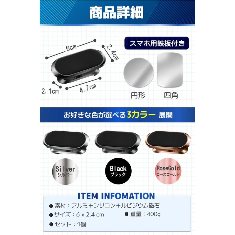 - Product Features: 1. Strong Rubium Magnet: Holds your smartphone securely, 2. Rotates 360 degrees: Adjusts to your preferred angle; 3. Luxurious design: Simple and easy to fit in any location; 4. Includes metal plate for smartphones: Round and rectangular steel plates
