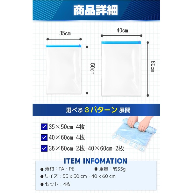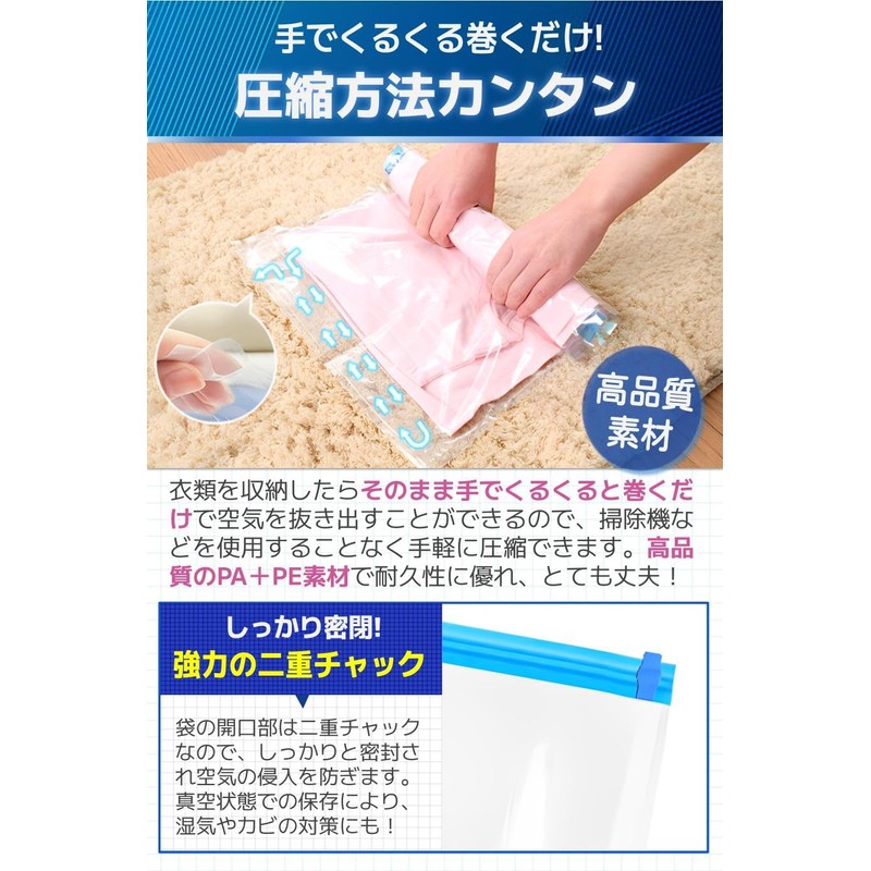 - Product Features: 1. Convenient without a vacuum cleaner: Compresses with just your hand without any troublesome tools. (2) High Quality PA + PE Material: Durable material for long life / 3) Space-saving: Stores bulky clothing and more. 4. Can be used repeatedly: Can be used repeatedly and not disposable
