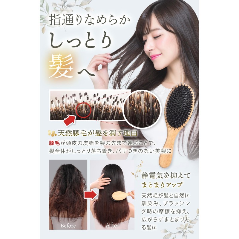 - 【静電気を抑える設計】豚毛の摩擦軽減効果により、ブラッシング時の静電気発生を最小限に。乾燥する季節でも髪が広がりにくく、まとまりある美しい髪に整えます。