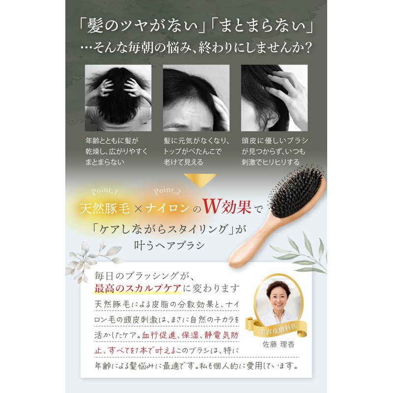 - 【天然豚毛とナイロンのダブル植毛】豚毛は髪の皮脂を均一に運び、ナイロン毛は頭皮に届いて血行を促進。もつれた髪を解きながら頭皮も優しく刺激。W効果で毛先までつやつや、根元からふんわり仕上がります。