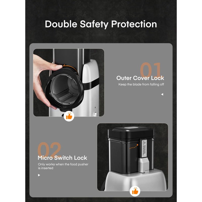 - 【Double Safety Protection】The safety ring on the discharge port rotates counterclockwise to effectively fix the blade and prevent it from flying out during operation. Even when the switch is turned on, you must use the push bar to activate the Micro Switch Lock on the electric grater to make the blade work properly, which will effectively protect your hands.