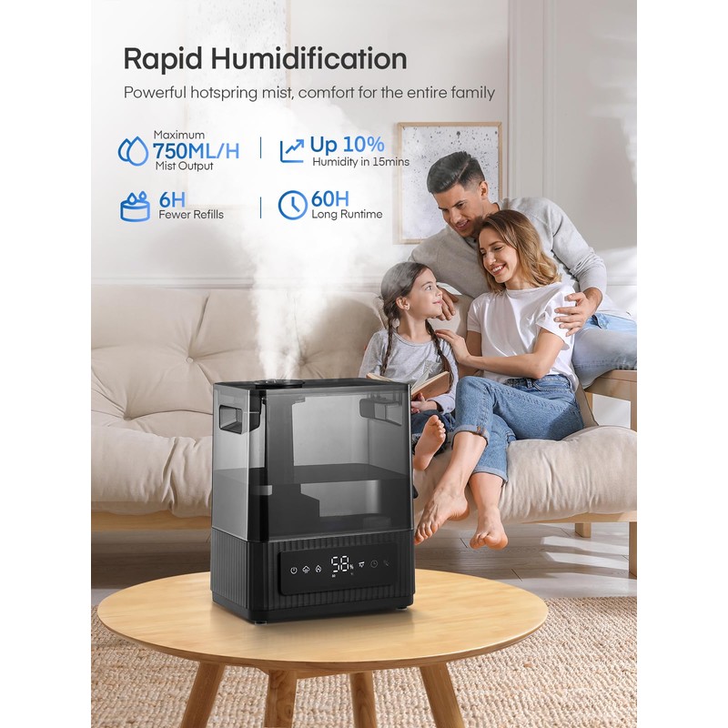 - High-Efficiency Humidification: Experience quick relief from dryness with our humidifier, boasting mist output that's 4 times faster than other humidifier with up to 750ml/h. Dual 360° rotating nozzles ensure even humidity distribution across large rooms. Enjoy continuous comfort with up to 60 hours of sustainable humidification.