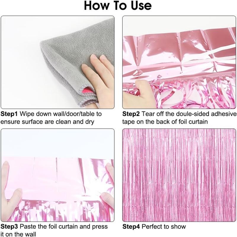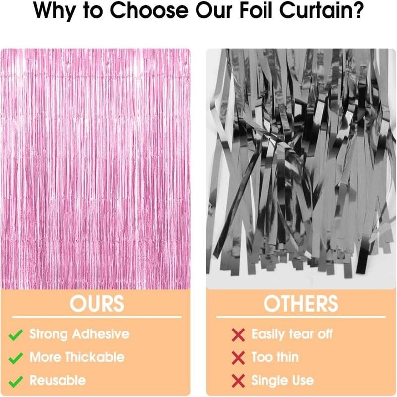 - Easy to Assemble: This foil fringe backdrop comes with double sided tape on the top so it's easy to hang on smooth surfaces such as wall, window, table, door or anywhere you like. This beautiful foil Fringe Curtains Party Decorations could stay hanging for days, surely transform your home or office into a classy and glittering party!