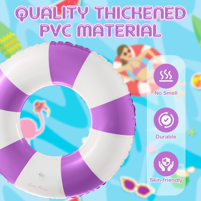 - Eye Catching Striped Design: flaunt your summer with our beautifully designed pool tube with handles; The jumbo striped swimming ring features an attractive classic striped pattern in lively purple and white, ensures you make a splash at every pool party or beach event; This pool floatie is not just an accessory for water fun but also attractive party decorations, will add a vibrant touch to your summer vibes