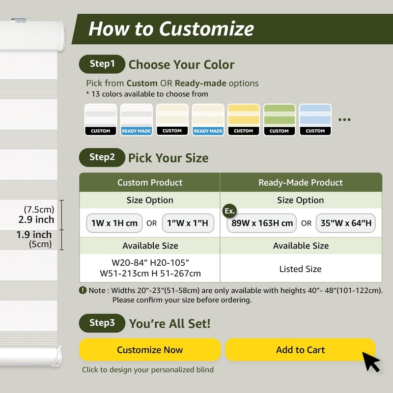 • ✒️ Customization Available: Zebra blinds can be customized 20 to 84 inches wide & 20 to 105 inches height. If your measurement is not listed in the size options, please place a CUSTOM size order. Various color collection is available. Please select Larger Standard size product with least gap from your measurement.
