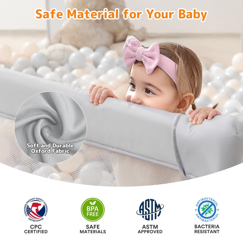 - Size of the playpen is 71 inches x 59 inches x 27 inches, which provides a lot of play space for children and their friends. Parents can also put toys in the fence and empty the room full of toys. In addition, we added a game mat and a hanging diaper box. Don't waste time and money choosing mats. Includes 4 pull tabs and 30 ocean ball, 1 Net Basket, to let your child have fun while learning how to stand