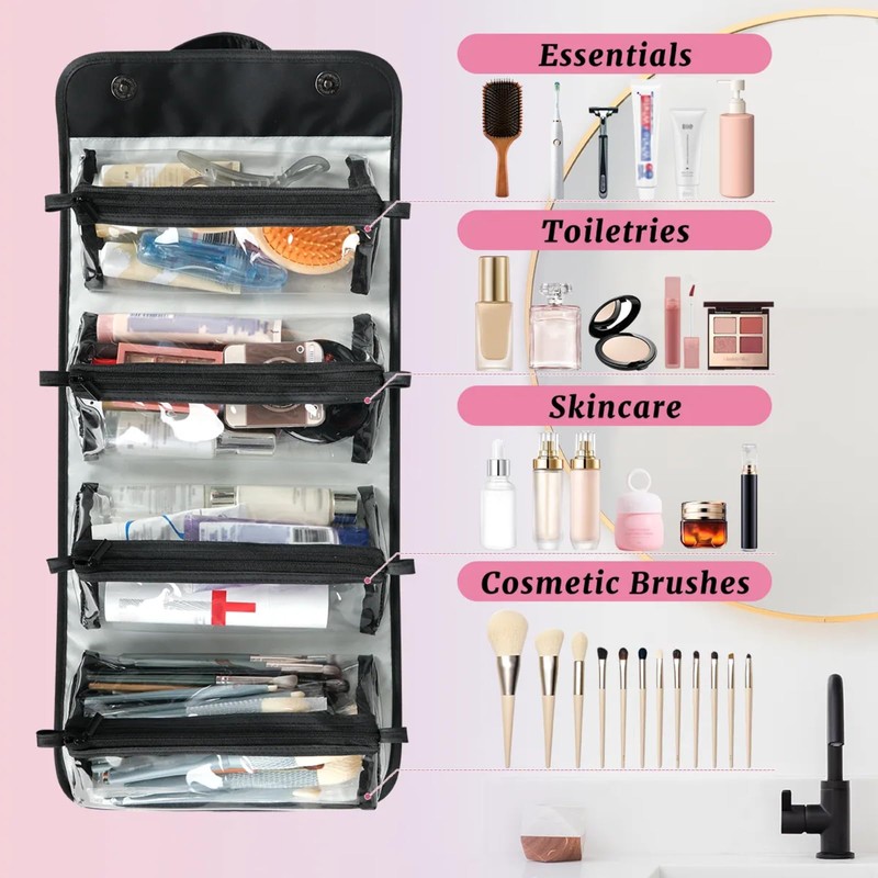 1. This is a multifunctional compact toiletry bag designed specifically for travel, providing ample space for your cosmetics, skincare products, and travel essentials.