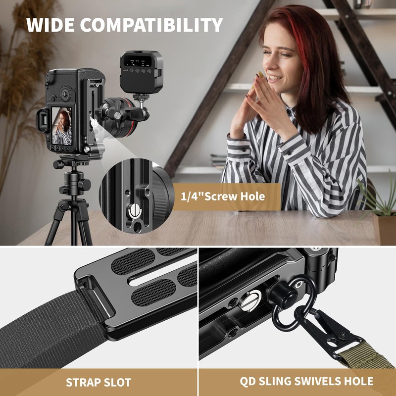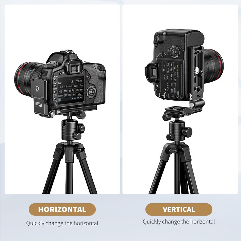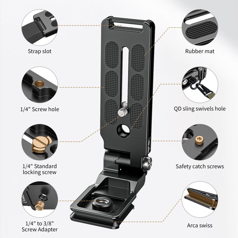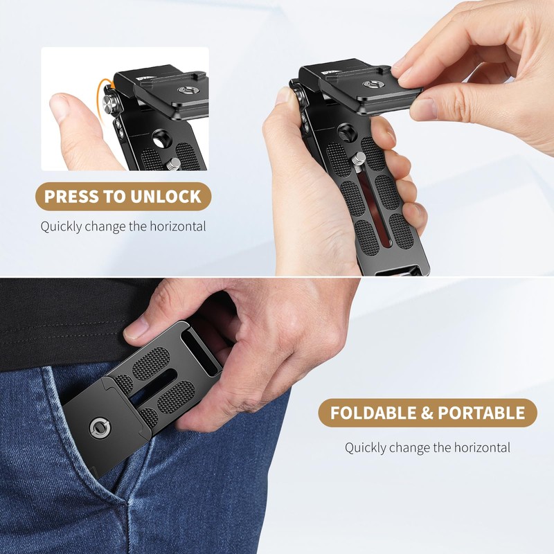 • ADJUSTABLE MOUNT This foldable L mount for DSLR cameras is universally applicable and provides horizontal as well as vertical camera orientation.