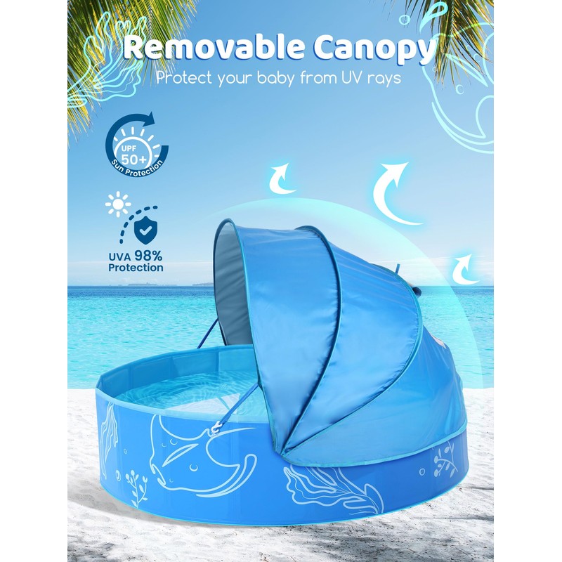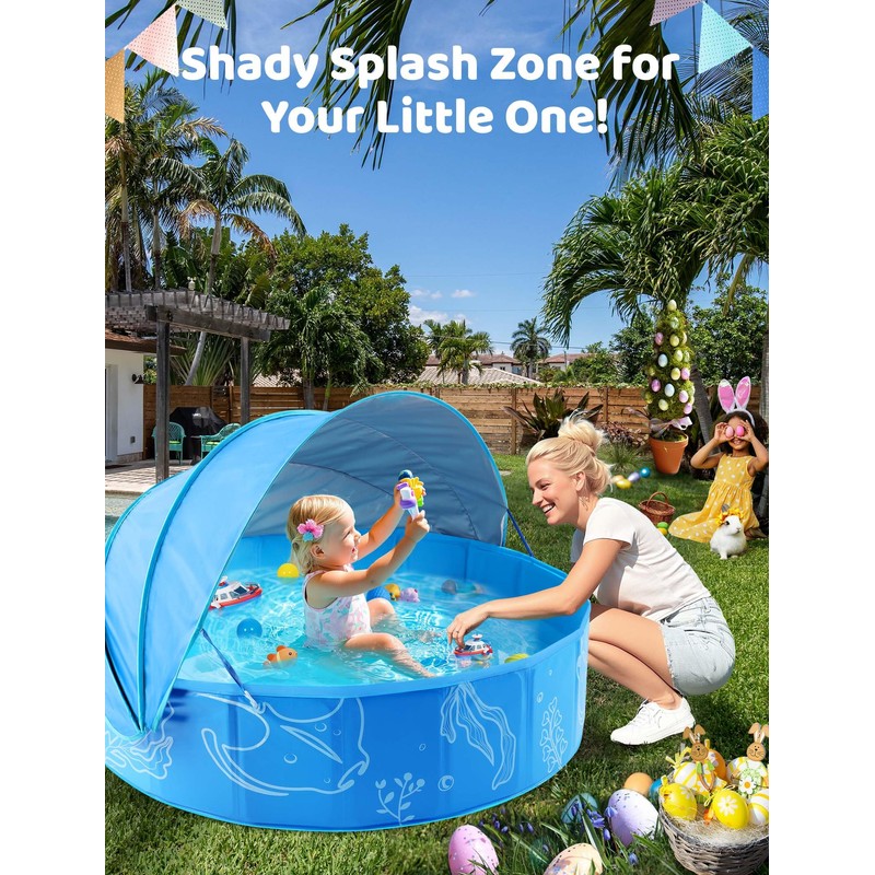 Hikiddy Foldable Kiddie Pool with Canopy: 47in Baby Pool and Beach Tent for Toddlers Infants 6-12 Months and Kids 2-4 Years Old - Portable Water Play with Shade for Outdoor Backyard Beach (Blue-Blue)