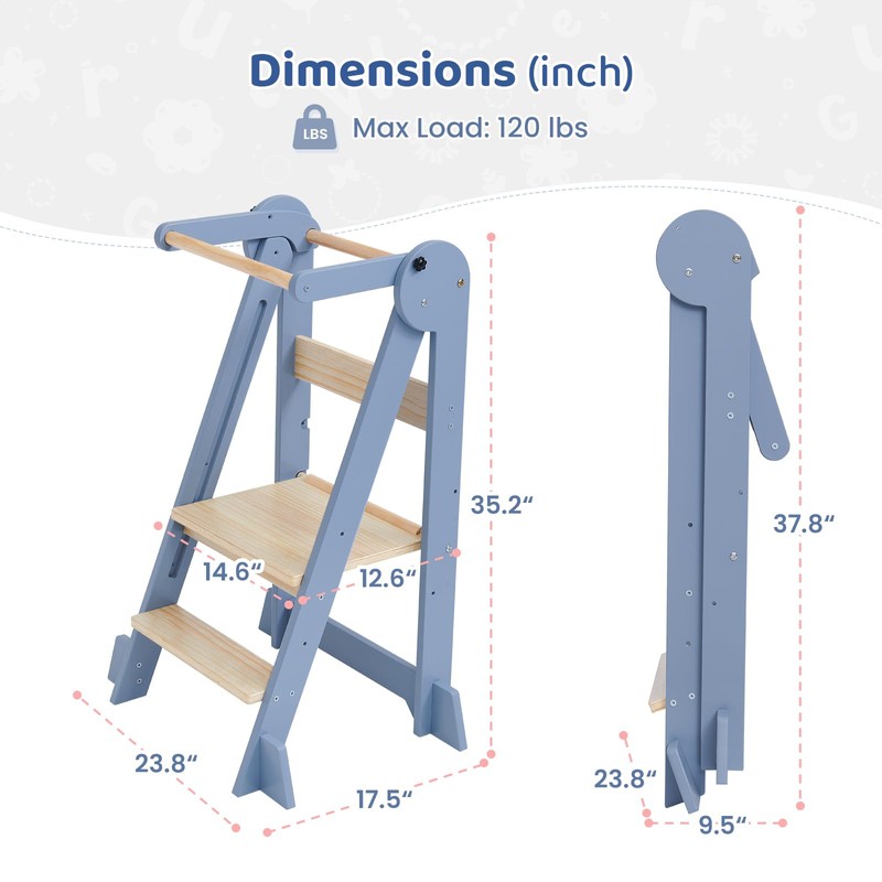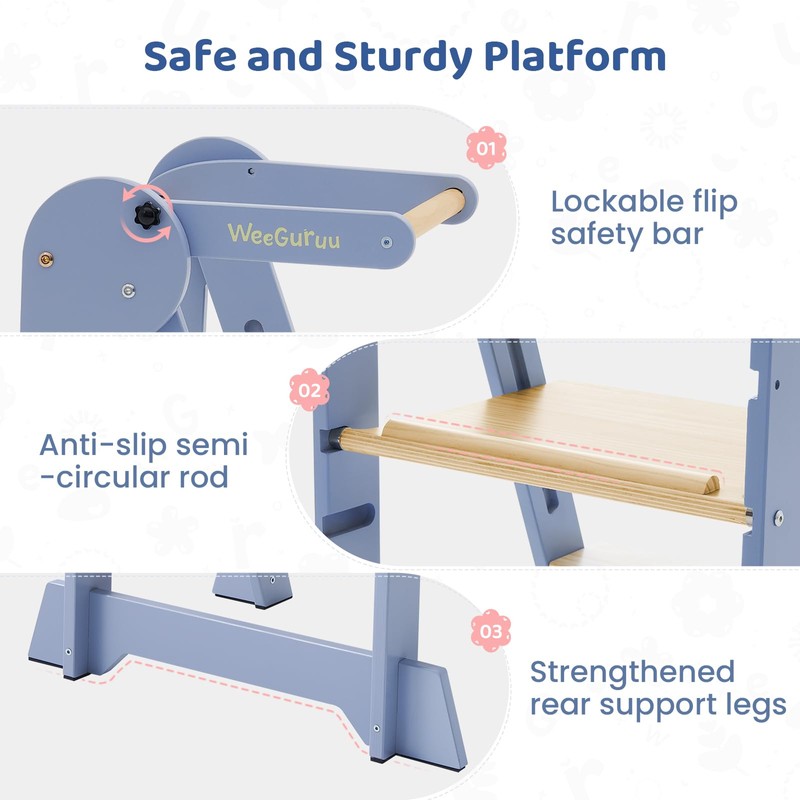 WeeGuruu Foldable Kitchen Tower, Height Adjustable Standing Tower for Toddlers Learning New Skills, Wooden Kids Kitchen Stool Helper with Safety Rails- Ages 18 Months to 6 Years