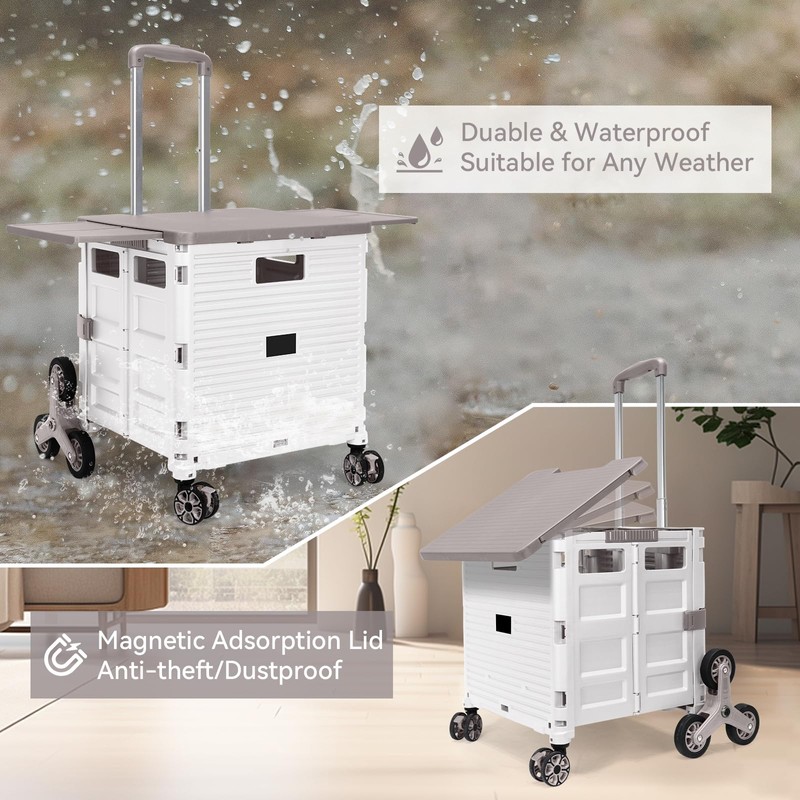 Foldable Utility Cart with Stair Climbing Wheels,Collapsible Rolling Crate with Magnetic Lid Telescopic Cover,Adjustable Telescoping Handle,360° Rotate Wheel Hand Cart for Teacher Shopping Moving