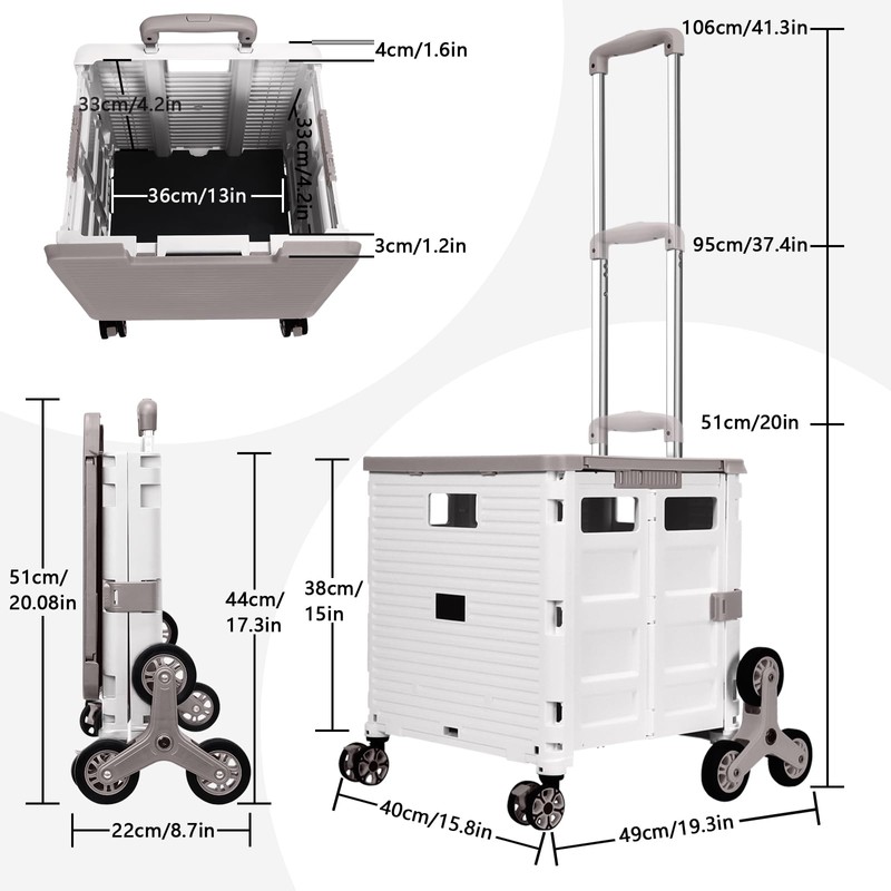 - 【360°Swivel front Wheels&Stair Climbing Wheels】We equip our Collapsible rolling cart with 6 stair climbing wheels and 2 360°noiseless Swivel Wheels with brakes.The TPE rubber wheels enhance the wear resistance, allowing you to experience optimal maneuverability,making it easier to carry heavy loads up stairs and easily turn and change direction on any bumps.