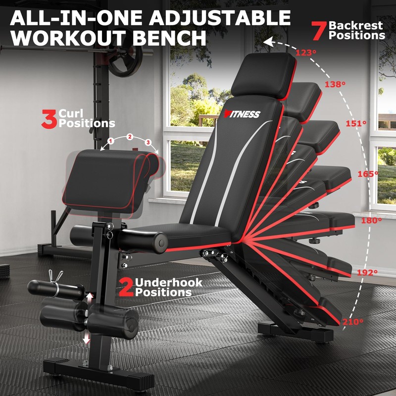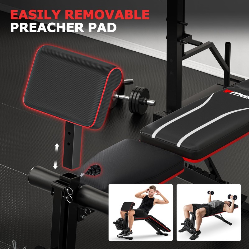 - 【Fast Adjustable Bench】This weight bench offers 7 adjustable back positions including incline, flat and decline, while it comes with a 3-position adjustable removable preacher pad to help you get a full-body workout that's tailored to your needs