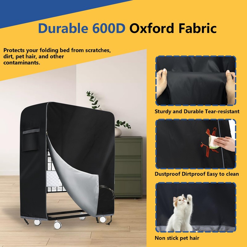 - Our folding guest bed cover is made of thicker 420D heavy duty oxford fabric and upgraded waterproof PU coating, water-proof and no odor. Perfect to cover and hide folding bed, Protect the folding bed from dust, water, dirt and scratches