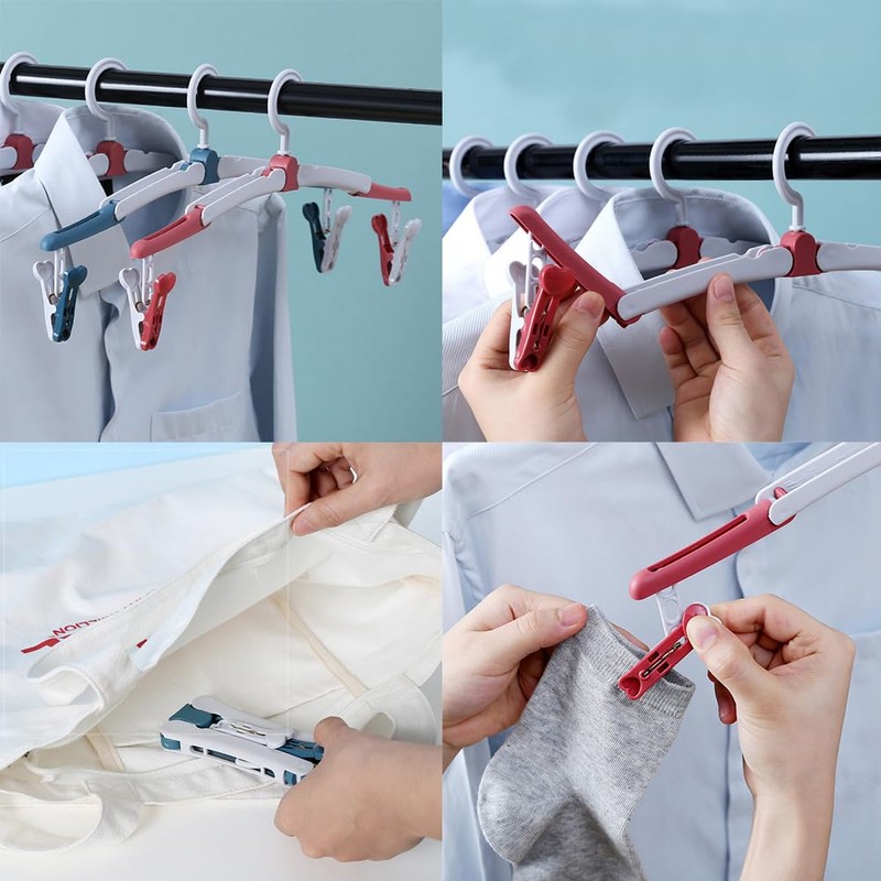 • 👚Package Contains: You will get 4 x red folding clothes hangers, 4 x blue portable clothes hangers, and 16 clips, the clips are detachable, hook can be rotated 360 degrees