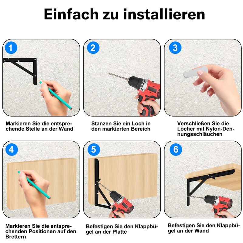 - Versatile application scenarios: adjustable as a folding table wall, balcony hanging table, shelf holder, folding shelf or trestles. Easy to assemble, perfect for garage workplaces, folding table hinges for children's desks, bathroom organisers, laundry tables in laundry rooms, bookshelves, kitchen shelves, display shelves and more.