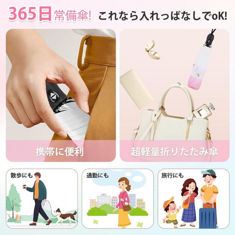 • Ultra lightweight and non-stressful portability: The latest version of this collapsible umbrella has a slimmer design compared to plastic bottles, making it easy to carry in your bag. The folding umbrella opens and closes automatically with one touch, making it very convenient for everyday use. It is only 3.5cm thick when folded and 25cm long, and it is large enough for men. The compact design also reaches an ultra-lightweight 7.1 oz (201 g). It is suitable for all weather, so it can be used as an umbrella for both sun and rain. It is useful in a variety of situations, such as commuting to school, work, excursions, travel, business trips, etc