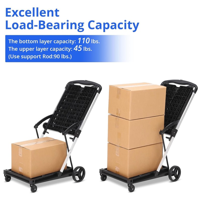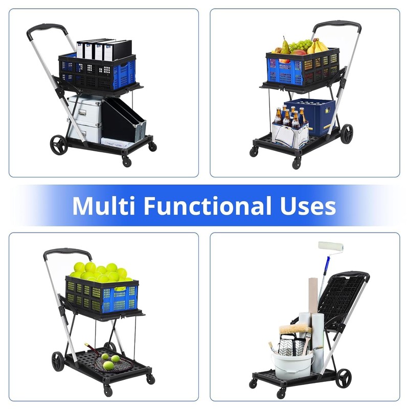 - Easily folds in seconds, the 2-tier collapsible service cart with a folding crate is easily folded with the push of a button (open/close).