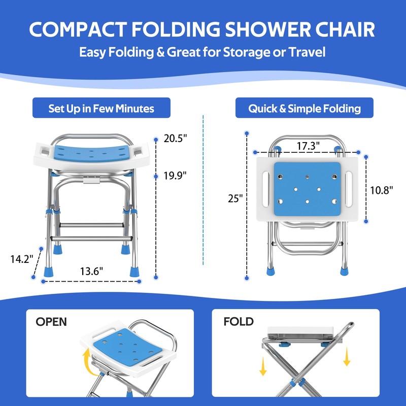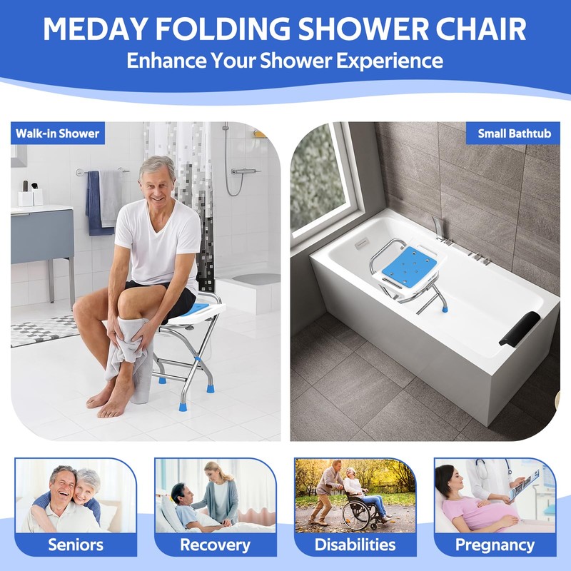 - MEDAY FOLDABLE SHOWER STOOL - Experience ultimate convenience with our foldable shower stool, designed for easy use at home or on the go. Quickly collapse the stool in just two simple steps when stepping out of the shower or needing a compact bath chair during your travels. Its innovative collapsible design not only saves valuable space in your shower but also fits effortlessly in your suitcase, making it the perfect companion for any trip