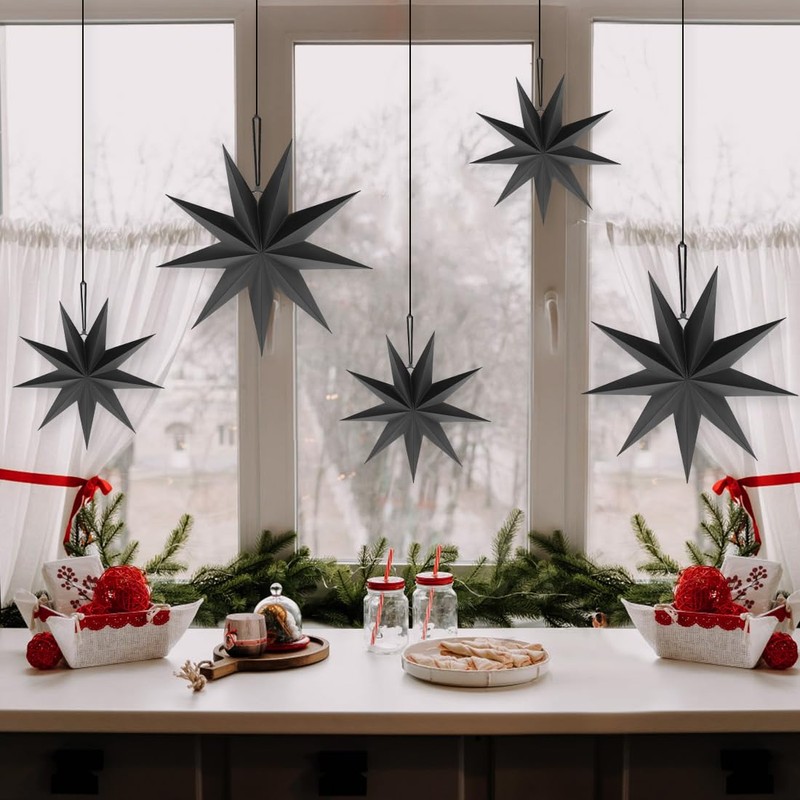- Christmas paper stars: Our Christmas paper stars set consists of a total of 5 large paper stars, 2 black paper stars with a diameter of 45 cm + 3 black paper stars with a diameter of 30 cm. The paper stars are equipped with a lanyard design. The colour of the lanyard is the same as the paper star.