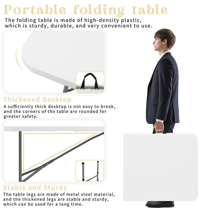 - 4 FT Folding Tables: You will receive heavy-duty folding tables measuring 4 ft/48 inches in length, 2 ft/23.6 inches in width, and 2.4 ft/29.1 inches in height. The tabletop of the table is made of high-density polyethylene material, and the support and legs of the table are made of high-quality metal steel, which is not only sturdy and durable, but also structurally stable and not easy to shake.