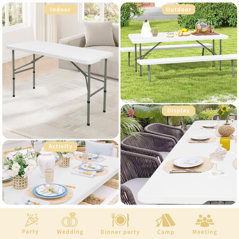 This folding table is suitable for various scenarios. It can be used indoors as a kitchen dining table, indoor dining table, office desk, study desk, craft table, etc. It can also be used outdoors as a table for picnics, camping, weddings, parties, barbecues, and other activities.